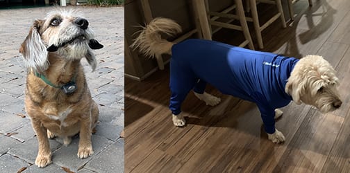 Hello, AFH! Our forever pups are doing great here in Florida. Buster (the blonde) is 10 and doing great, although his visits to the senior center as a hospice therapy dog didn’t agree with his sensitive skin so the vet suggested this nifty protective outfit. I can’t say he loves it. Kermit is 7 and still a hilarious curmudgeon. He is never without a toy in his mouth. He’s pictured here with his beloved bat from Halloween. Thank you for giving us these wonderful pups who have brought us so much joy!!!