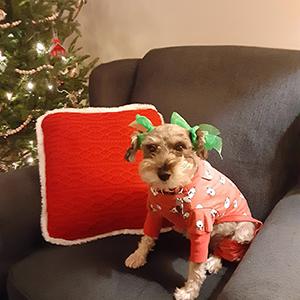 Hello! I want to send my yearly thank you for rescuing my beloved schoodle Izzy (nee Elena) from a Missouri puppy mill in 2009. She is my utter joy and love. She's about 11.5 now and still as spunky as ever. While she prefers to run outside and roll in the mud, I did put her in her Christmas PJs and put bows in her hair a few days ago and captured this adorable photo. See attached. I thought you may giggle. Thank you again for all that you do- have an amazing New Year!
