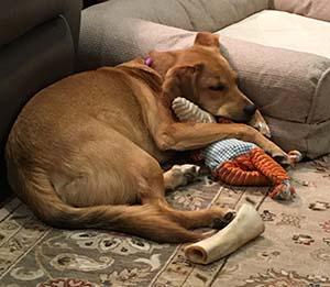 Ruby is adjusting well and feels very comfortable in our home. She absolutely adores children of all ages and my husband! She listens well and is obedient most of the time - especially if treats are involved. Ruby sleeps in our room on her bed and waits for us to arise before she gets up. Tennis balls continue to be a joy for her and her favorite toy, as you can see, is the one you sent with her. She has definitely filled a void in our lives. Thank you for being a wonderful foster and preparing her to move on to her forever home.