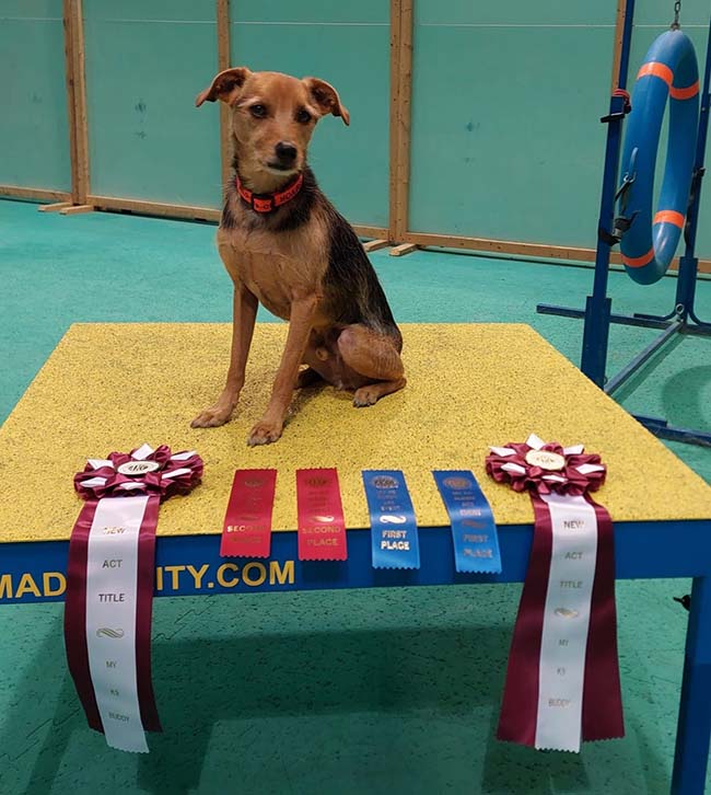 Dear AFH:   A happy update from Trevor (aka Baxter adopted 2014).  Trevor will turn 10 years old in March 2024 and we would like to share our happy news to celebrate his wonderful achievements.  With titles in obedience, rally, Fast CAT, parkour, and trick dog  - we have had a great run.  Last year we decided to get our feet wet in agility with Trevor at the "young" age of 9 years. He was by far the oldest dog in his class. He took to it eagerly and seems to love it.   We were thrilled to earn our first agility titles November 2023 (see pic).  Trevor is the first mixed breed dog ever to earn the Extreme Versatility Dog Program's XVE (Excellent level) title, acknowledging his achievement in a wide variety of sports.  He is the first mixed breed in the U.S. to earn their XV50 title - that's 50 verified titles overall.  So proud of him, starting as a reactive and shy dog, and becoming then a confident and steady boy he has become.  My best buddy.